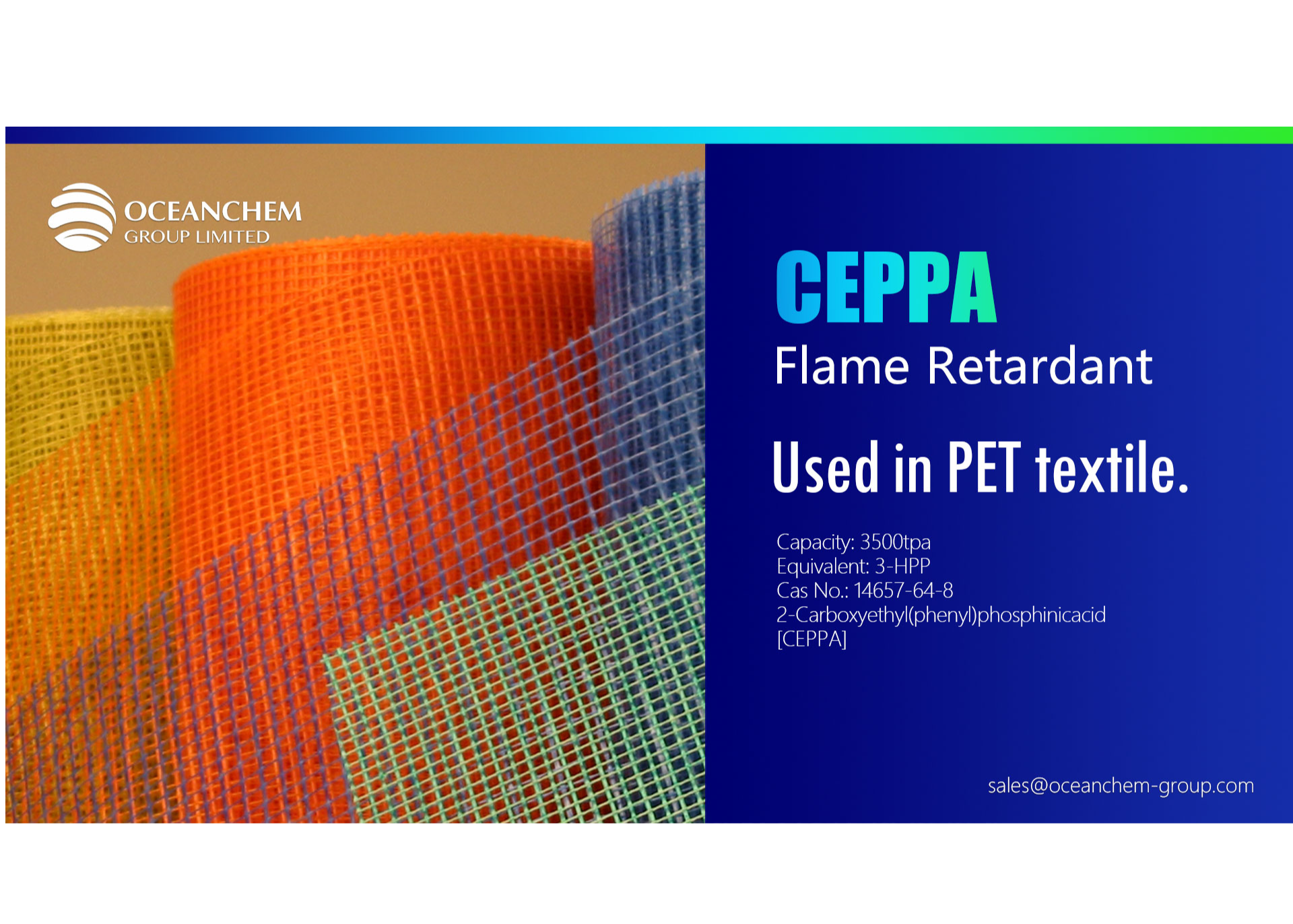 它是一种环保型阻燃剂,可用于聚酯的永久性阻燃改性,阻燃聚酯的可纺性与PET相似,可用于各种纺丝系统,具有热稳定性好、纺丝不分解、无异味等特点。它可用于PET的所有应用领域,以提高聚酯的抗静电能力。